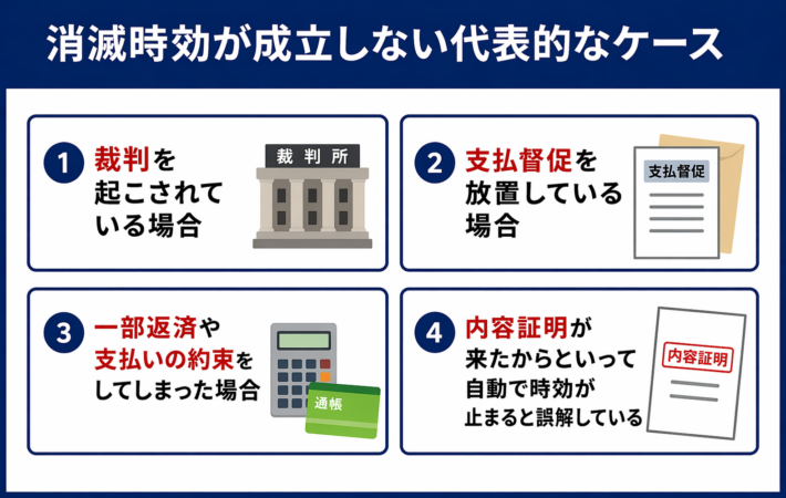 さらに、その間に裁判、支払督促、債務の承認など、時効の完成を妨げる事情がないことも重要です。