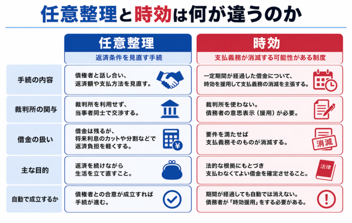 任意整理と時効は、どちらも借金問題の解決に関わる制度ですが、役割はまったく違います。