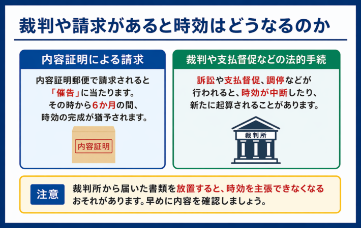 借金の請求といっても、普通の督促状、内容証明郵便、裁判所からの訴状、支払督促などでは意味が違います。法テラスの説明では、内容証明郵便による請求は「催告」に当たり、その時から6か月の間、時効の完成が猶予されます。つまり、内容証明が届いたから直ちに終わりという話ではなく、一定の法的効果があります。