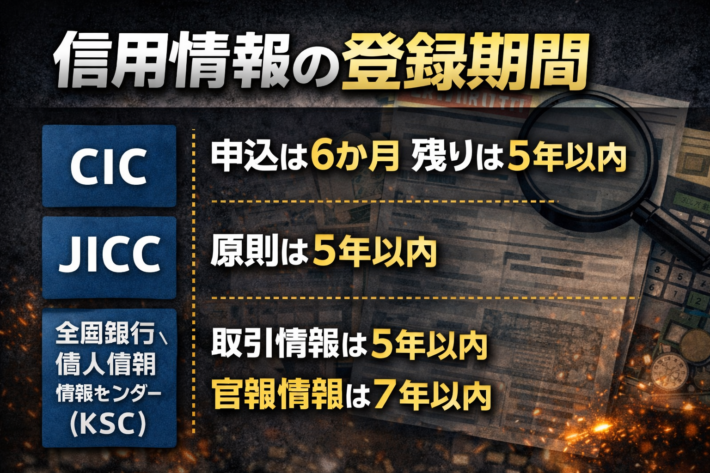 「KSCは7年残る」という表現が広まっていますが、正確には官報情報のみが最長7年です。通常の取引情報は5年以内です。この区別は非常に重要です。