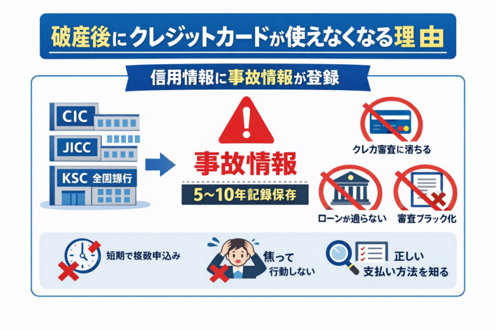 破産後にカードが作りにくくなる理由は、信用情報機関に事故情報が登録されるためです。