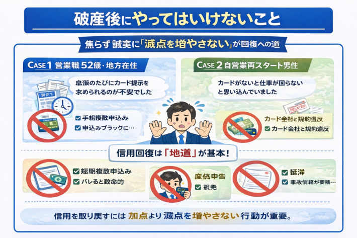52歳の営業職男性。破産から8年が経過。出張があり、カード提示を求められる場面も多い状況でした。