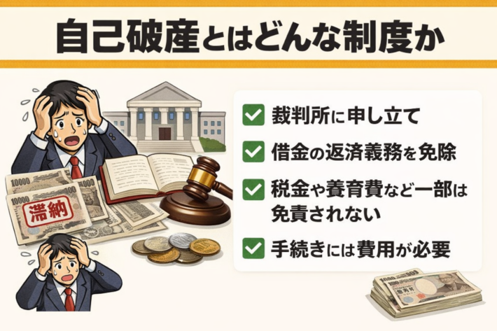 自己破産とは、裁判所に申し立てを行い、借金の返済義務を免除してもらう制度です。