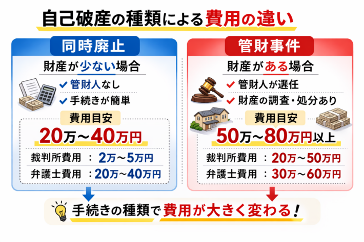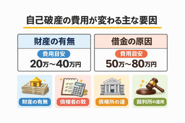 自己破産の費用は、手続きの種類や財産の状況、裁判所の運用などによって大きく変わります。