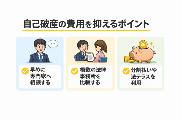 自己破産の費用は決して安くありませんが、次のようなポイントを意識することで負担を減らせる場合があります。