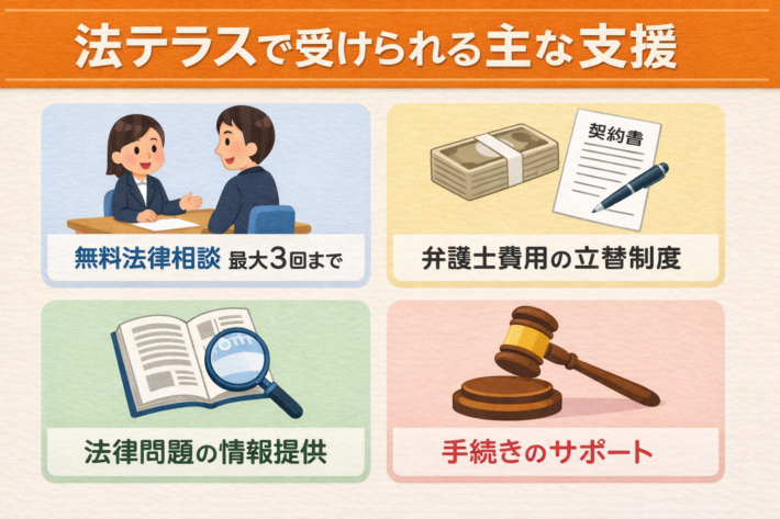 法テラスは、法律トラブルを抱えた人に対して情報提供や相談窓口の案内を行う公的機関で、条件を満たせば 無料法律相談や弁護士費用の立替制度 を利用できます。
