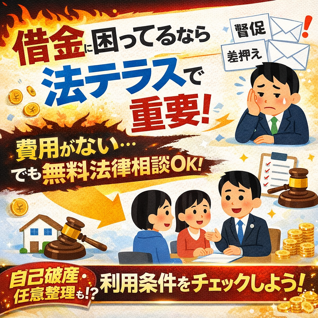 任意整理,個人再生,借金問題,借金救済制度,借金相談,借金解決,債務整理,弁護士費用立替,民事法律扶助,法テラス,法テラス借金相談,法テラス利用条件,法テラス収入基準,法テラス無料相談,自己破産