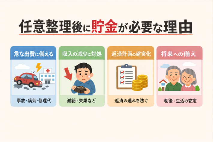 任意整理後は借金が減ることで一時的に安心しますが、実際には「資金の余裕がない状態」が続きます。ここで貯金の重要性を理解していないと、再び同じ状況に戻る可能性があります。