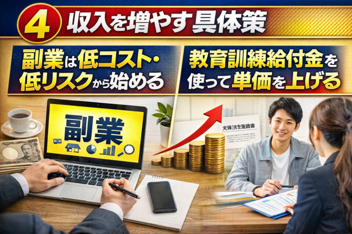 次に、転職や職業訓練、公的給付制度を活用して、収入の土台を上げます。そのうえで、副業は低コスト・低リスクのものから小さく始めます。