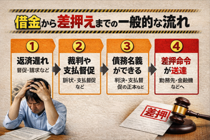 民間の借金は、返済が遅れただけですぐ差し押さえになるわけではありません。通常は、裁判や支払督促などを経て、債務名義が整ったあとに差し押さえへ進みます。