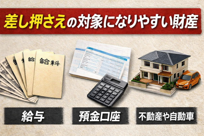 差し押さえの対象になりやすいのは、給与、預金、不動産などです。ただし、給料の全額が取られるわけではなく、生活を守るための差押禁止の仕組みがあります。